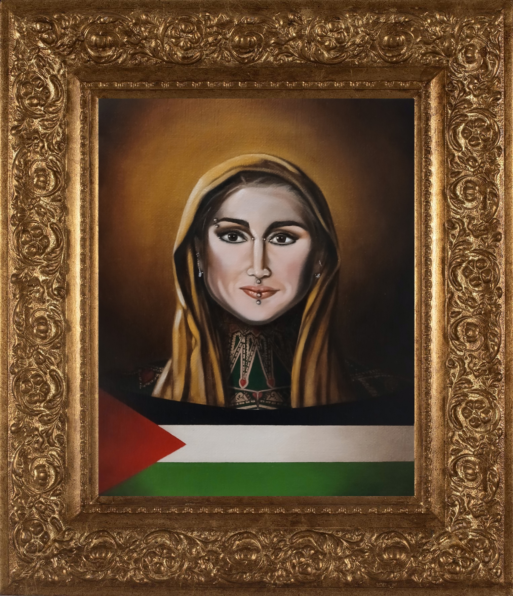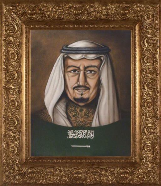 In quest'opera della collezione Rock Art Ciotola, Raffaele Ciotola sfida i confini della rappresentazione istituzionale, ritraendo Re Salman dell'Arabia Saudita attraverso una lente audace e contemporanea. L’artista opera una sintesi visiva tra il rigore della tradizione araba simboleggiata dalla bandiera verde e dal vestiario cerimoniale e la cultura "underground" del rock, evidente nei piercing che ornano il volto del sovrano.