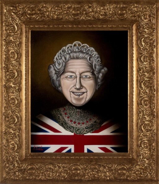 In this artwork, the artist Raffaele Ciotola wants to represent His Majesty Elizabeth II in the guise of the Rock Queen. This historical character conveys authority, seriousness and struck the artist’s mind since his childhood. The respect that binds him to His Majesty leads him to feel congeniality, so he wants to transform her, through art, into a character which can be closer to the youth of the whole world. A Queen with a look that definitely takes distance from herinstitutional role. This artwork is inspired by thegreat tenderness that R.Ciotola feels towards her, so it represents her in this way in order to attract youth’s attention not towards any ordinary old woman, but towards a Queen marking the history. Generally Queens born live and die like all ordinary mortals, but the artist wanted to immortalize the fondness and the extraordinary tenderness of His Majesty Elizabeth II in an unusual form, so that the young people do not remember her only on history books, but immortalized through this framework that portrays her with the same appearance that many young people love. She is represented with tattoos and piercings, taking on a disobedient and determined appearance, rebelling against stereotypes and patterns just as young people do.